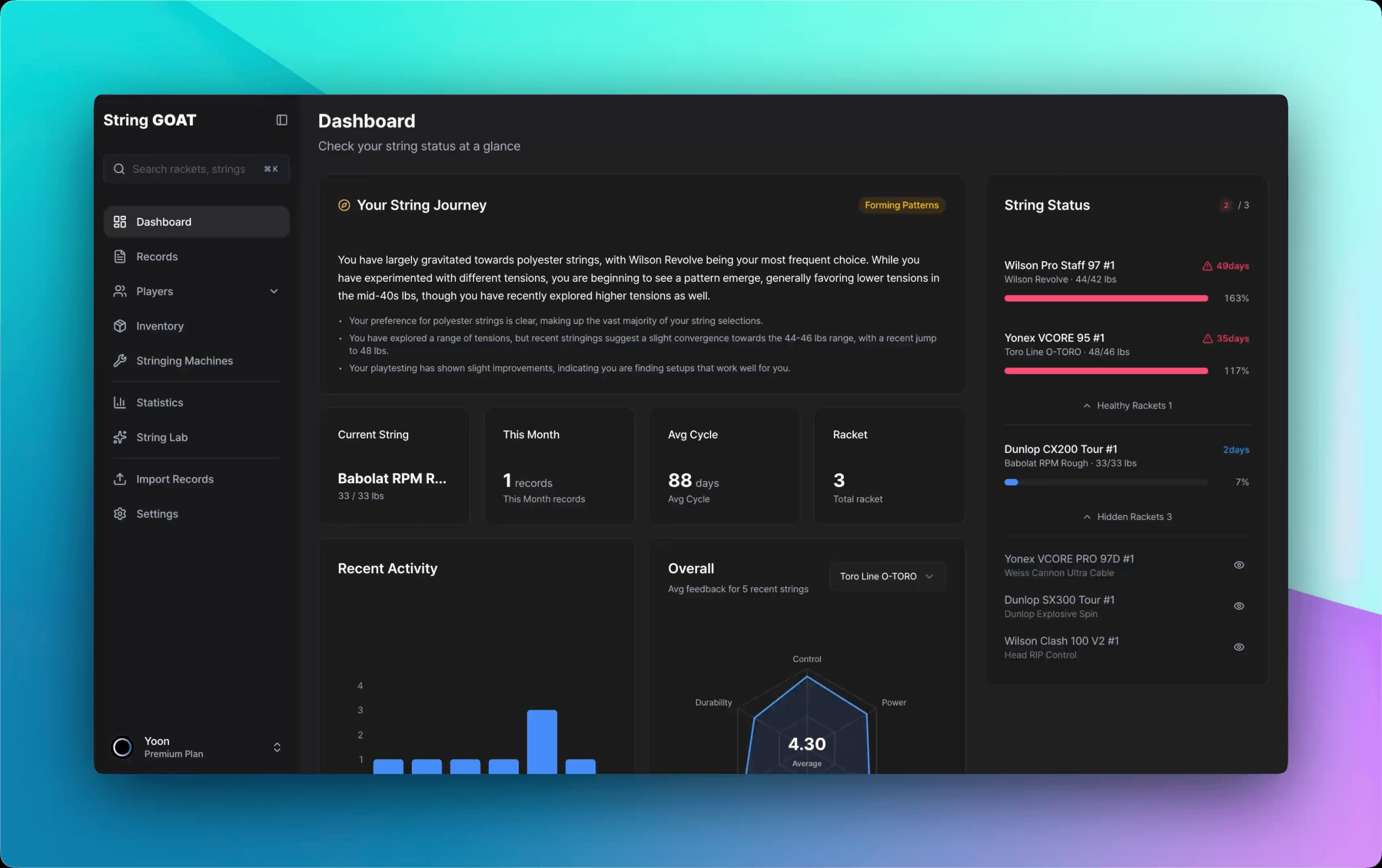 String GOAT की AI आपकी स्ट्रिंगिंग और फीडबैक डेटा को सीधे इनपुट के तौर पर लेती है। डेटा कम हो तो जवाब आम होता है; जैसे-जैसे टेंशन वेरिएशन और छह स्लाइडर की रेटिंग जमा होती हैं, सुझाव आपके पैटर्न के क़रीब आता है — "यह यूज़र पॉली के लगभग 22 kg पर सबसे अच्छा कंट्रोल स्कोर देता है"। होम स्ट्रिंगर का एक्सपेरिमेंट वॉल्यूम सीधे रेकमेंडेशन की क्वालिटी का लीवर है।